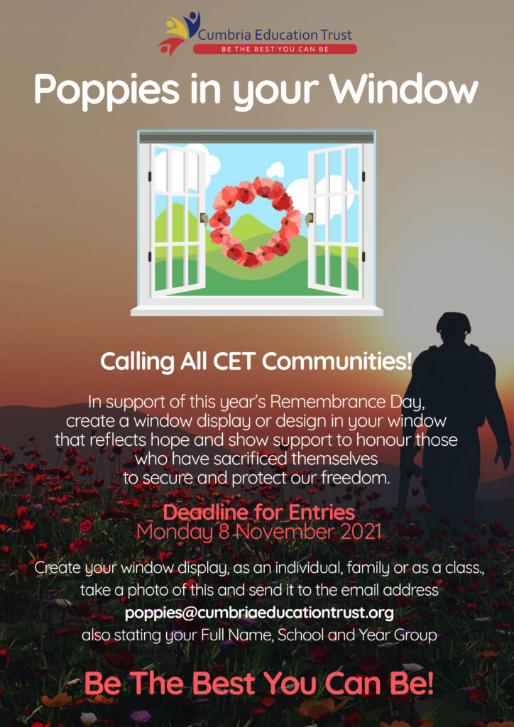 Please send a photo of your window display completed at home or in school and any other acts of remembrance that you are involved in to poppies@cumbriaeducationtrust.org by Tuesday 9 November, to be included in our CET montage.